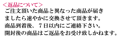 | 不良品 | 万一不良品等がございましたら、当店の在庫状況を確認のうえ、新品、または同等品と交換させていただきます。 商品到着後7日以内にメールまたは電話でご連絡ください。それを過ぎますと返品交換のご要望はお受けできなくなりますので、ご了承ください。 |